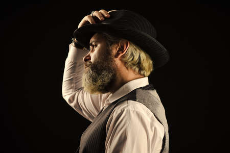 Past centuries trend. Bearded guy black background. Beard grooming. Retro gentlemen. Mature handsome man. Man in vintage hat side view. Brutal bearded hipster. Real masculinity. Masculine appearance