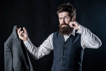 Man bearded hipster wear formal suit with shirt vest and jacket. Elegant custom outfit fashion. Tailoring and clothes design. Custom made to measure. Designing made to measure suit. Custom made suit