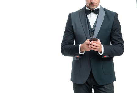 mature tuxedo man messaging on smartphone isolated on white background