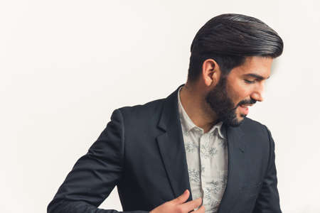 indian young handsome black hair man in stylish business suit in studio isolate white background