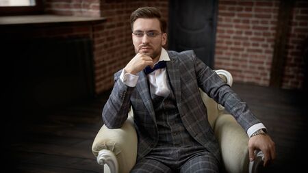 Handsome gentleman sitting relaxed on a vintage armchair in a loft interior. Full length portrait.
