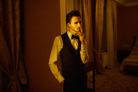An attractive young man in elegant evening suit stands alluringly at the entrance to the bedroom holding finger to lips. Luxury apartment in the subdued night light. Glamor lifestyle. Men's fashion.