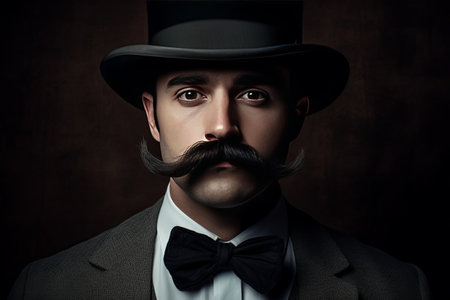 photo of tuxedo presenter in cylinder hat. tuxedo presenter isolated on black background.