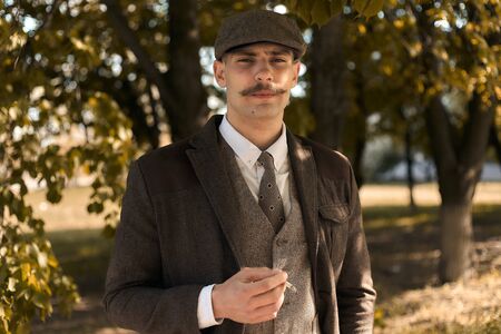 Retro 1920s portrait of an English gangster with a flat cap. Smokes a cigarette on the street..