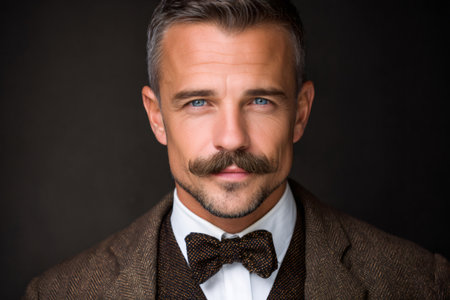 Man with gray hair and blue eyes wearing a tweed suit and bow tie