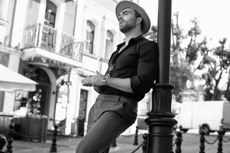Portrait of a beautiful brutal tanned muscular hipster man in black shirt, hat and sunglasses posing in the streets of the European city