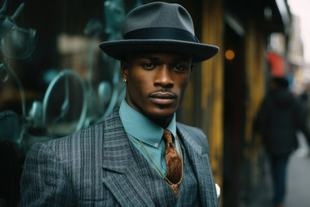 Handsome african american man in hat and jacket posing in city street