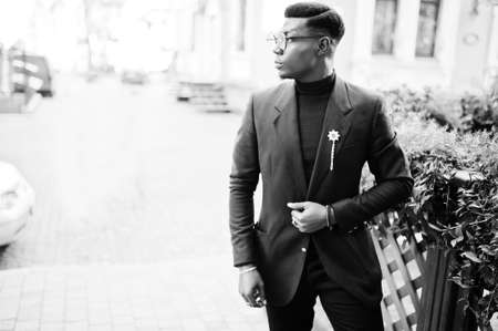 Amazingly looking african american man wear at blue blazer with brooch, black turtleneck and glasses posed at street. Fashionable black guy.