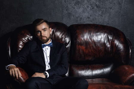 Handsome man sitting on the leather sofa