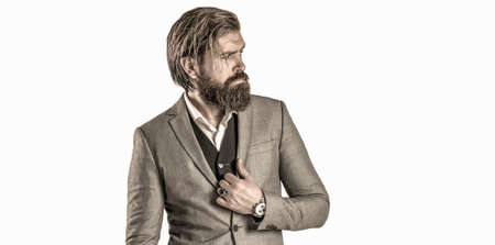 Beard man in suit with classic long beard, bearded gay. Barber, barbershop. Mustache men. Templates web banner design. Horizontal banner for website header with text copy space.