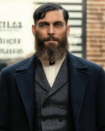 Portrait of a handsome man with a long beard and mustache wearing a coat