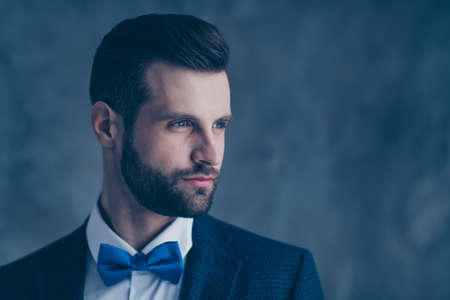 Bearded young man in a suit and bow tie. Mens emotions.