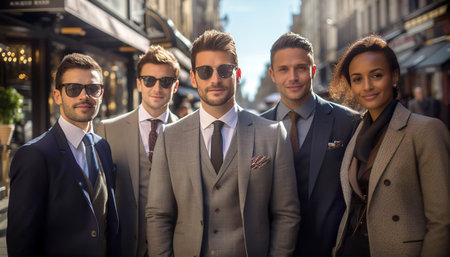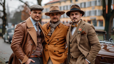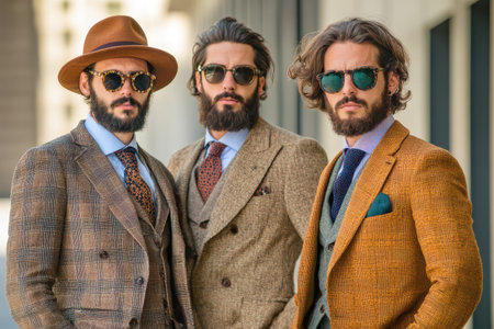 Three well dressed men stand together in an urban environment. They wear stylish suits sunglasses and hats exuding confidence.