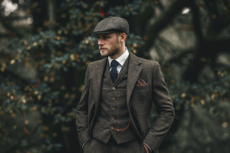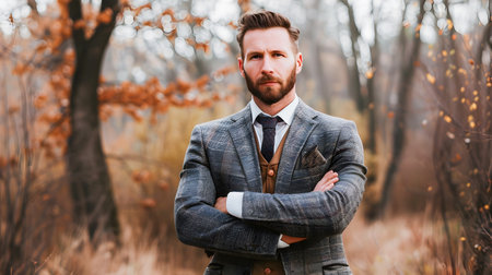 A stylish man posing in a plaid suit in a woodland setting exuding a sense of fashionable elegance in a natural and atmospheric environment