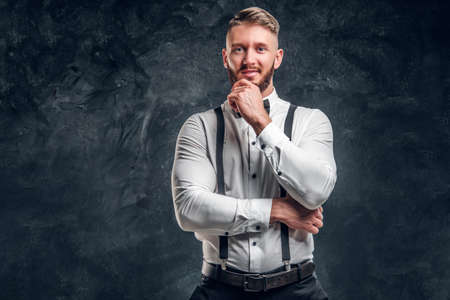 Old-fashioned young man in shirt with bow tie and suspenders posing with hand on chin. Studio photo against dark wall background