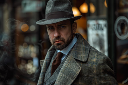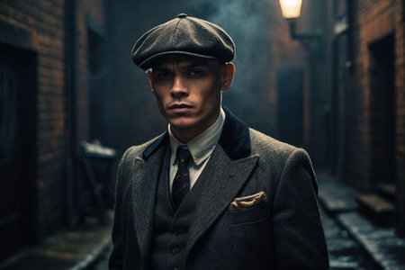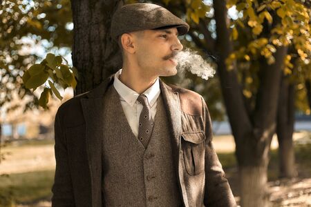 Retro 1920s portrait of an English gangster with a flat cap. Smokes a cigarette on the street..