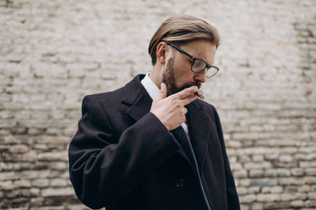 Stylish man smoking near old brick wall