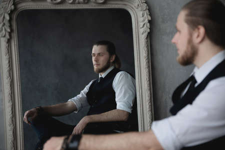 Portrait of a handsome young man with a beard in a suit
