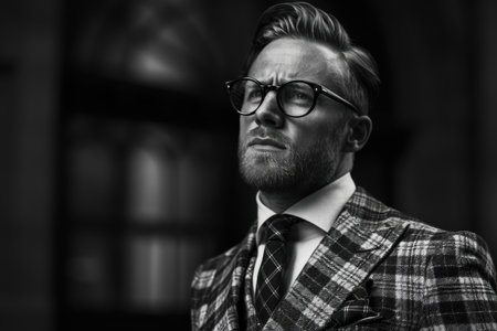 Stylish man in checked suit with turtleneck stands confidently in elegant indoor setting during daytime Generative AI