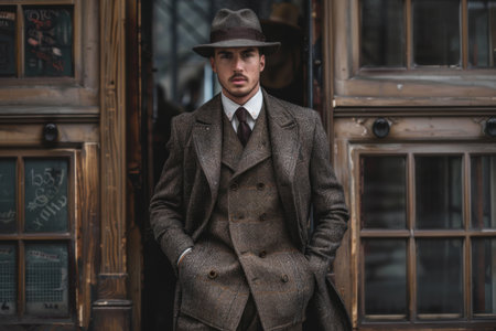 A man posing in the image of an English retro gangster of the 1920s dressed in Peaky blinders style at city street.