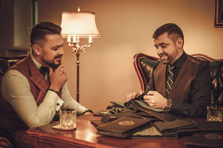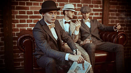 Business people club. Three handsome men in elegant suits sit on a leather sofa in apartments with loft interior. Men's fashion.