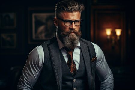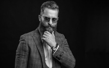 Portrait of a serious handsome man with a beard and mustache wearing elegant suit and spectacles. Men's beauty, fashion. Businessman portrait. Optics for men.
