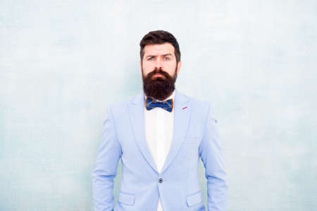 Suit style. Fashion trends for groom. Groom bearded hipster man wear light blue tuxedo and bow tie. Wedding day. Stylish groom. Statement with his stunning crisp suit jacket. Stylist fashion expert