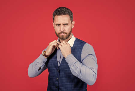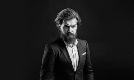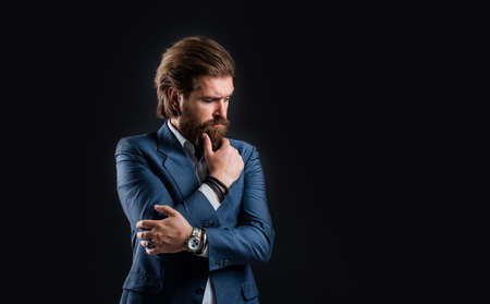 Man bearded hipster modern outfit for business life, hard decision concept