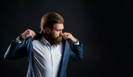 bride groom. mens office wardrobe. fashionable man dressed in suit. formal fashion model. handsome man on gray background. serious bearded businessman. stylish mature man looking modern