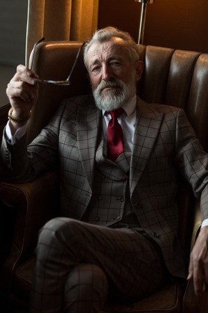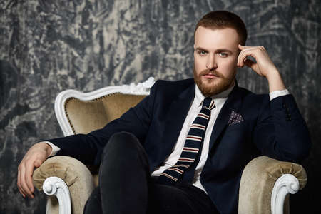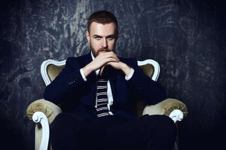 Respectable handsome man sitting in classical vintage armchair. Men's beauty, fashion. Luxurious lifestyle.