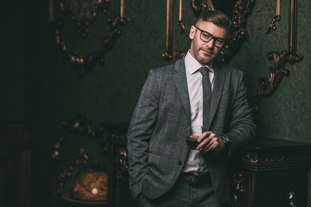 Handsome gentleman poses in a tweed suit and glasses in a vintage interior. Luxurious lifestyle. Vintage style.