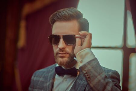 Handsome man poses in a checkered suit and sunglasses in a vintage interior. Luxurious lifestyle. Man's fashion.