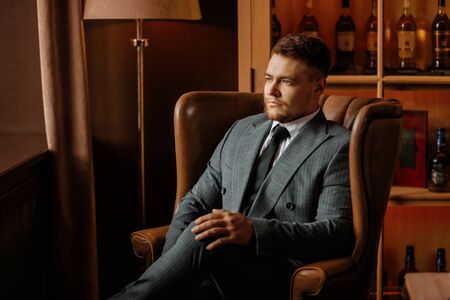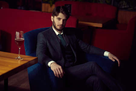 Portrait of a handsome respectable brunet man in elegant classic suit sitting in an armchair in a restaurant. Men's beauty, fashion. Business style.