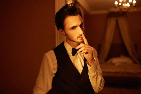 An attractive young man in elegant evening suit stands alluringly at the entrance to the bedroom holding finger to lips. Luxury apartment in the subdued night light. Glamor lifestyle. Men's fashion.