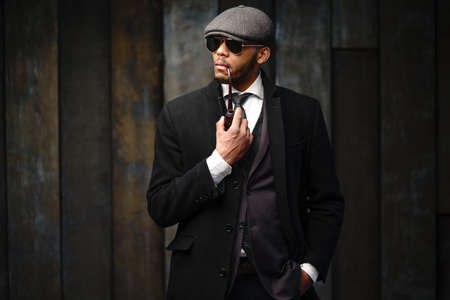 Studio shot of stylish african american man wearing coat, cap, glasses and holding smoking pipe