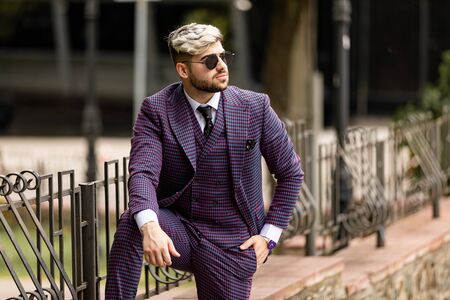 business man in glasses and violet luxery three-piece suit, bow tie posing on the street
