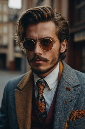 Serious bearded man wearing a hat and suit is posing in the city