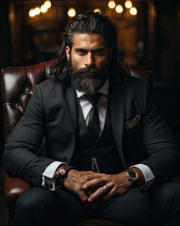 A man with a beard and mustache is sitting in a chair wearing a suit and tie. He looks thoughtful and serious