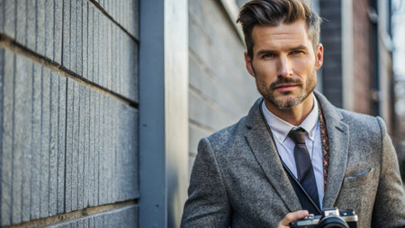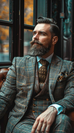 Elegant Man with Beard and Mustache wearing stylish suites in front of a gray studio background