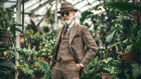 Stylish elderly caucasian man in minimalist attire relaxing in eco-friendly greenhouse. concept of sustainable fashion, minimalism lifestyle, nature harmony, sophisticated elegance.