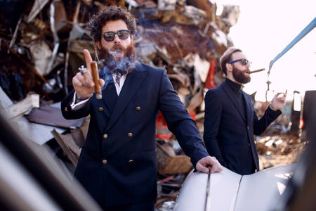 Stylish bearded mens in black suits and sunglasses smokes cigars on the iron dump background. Gentlemen's club.
