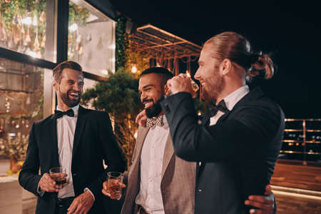 Three happy men in suits holding glasses with whiskey while spending time on party