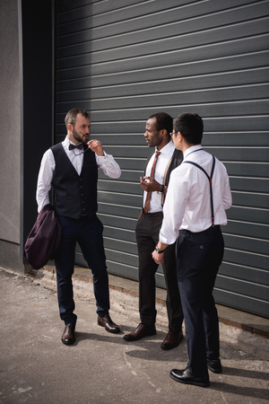 young multiethnic businessmen in formalwear talking at break outdoors