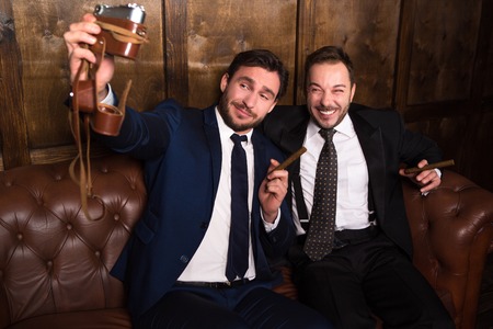 Rich businessmen with cigars making photos while spending time in restaurant. Russian business people drinking alcohol and making money.