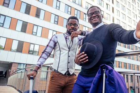 Two handsome positive men in formal clothes
