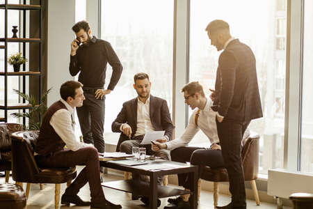 Portrait of four handsome good looking men in elegant classic suits spending time in a restaurant. Men's fashion. Business people club.