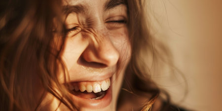 Close-up portrait of a joyful woman laughing heartily with her eyes closed, capturing a moment of genuine happiness and contentment.