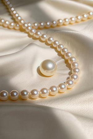 A stunning pearl resting on soft silk fabric, showcasing elegance and luxury. The play of light on the smooth surface creates a serene and artistic atmosphere.