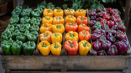 A vibrant display of green, yellow, orange, and purple bell peppers arranged neatly in wooden crates at an outdoor farmers market. The arrangement highlights their freshness.