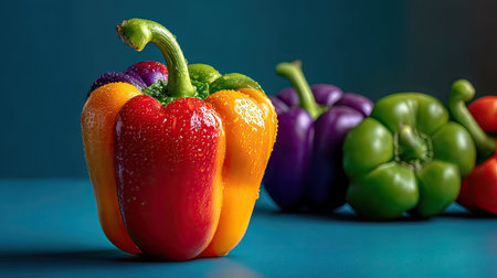 This striking image features an array of colorful bell peppers, showcasing vibrant hues of red, yellow, green, and purple, accentuated by fresh water droplets. Perfect for promoting healthy eating and fresh ingredients in culinary content.